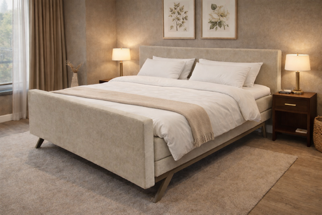 Om deze boxspring geheel compleet af te maken, combineren we er ook nog een voetbord aan in dezelfde stijl als het hoofdbord. Zo blijven de matrassen perfect op het bed liggen, kunt u de lakens makkelijk instoppen en geeft de boxspring net nog even wat meer uitstraling.